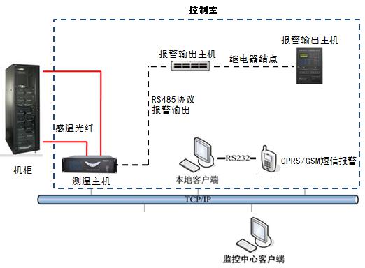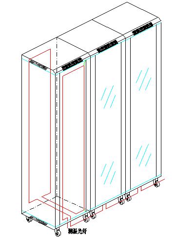 本項目用于機房內(nèi)部機柜內(nèi)溫度檢測,感溫光纖依次從每個機柜下方進入機柜,繞機柜前、后面各一周測量機柜內(nèi)的溫度。每個機柜內(nèi)光纖長度固定,我們可以將機柜內(nèi)的光纖長度看做一個測溫分區(qū),只要在該長度光纖內(nèi)有高溫報警,則系統(tǒng)判斷該機柜超溫報警。測溫主機將監(jiān)測溫度通過網(wǎng)絡(luò),以TCP/IP協(xié)議上傳至本地客戶端及監(jiān)控中心客戶端,在客戶端安裝監(jiān)控軟件后可以實時顯示每個機柜溫度信息。當某個機柜出現(xiàn)異常高溫報警時,測溫主機通過RS485串口協(xié)議將報警信息傳輸給或者報警系統(tǒng),進行相應(yīng)滅火處理。我公司生產(chǎn)的FET-8608L型光纖測溫主機,該主機有8通道(另有2、4、8通道可選),并且測試覆蓋范圍可擴展,光纜覆蓋距離2KM、4KM、8KM可選。